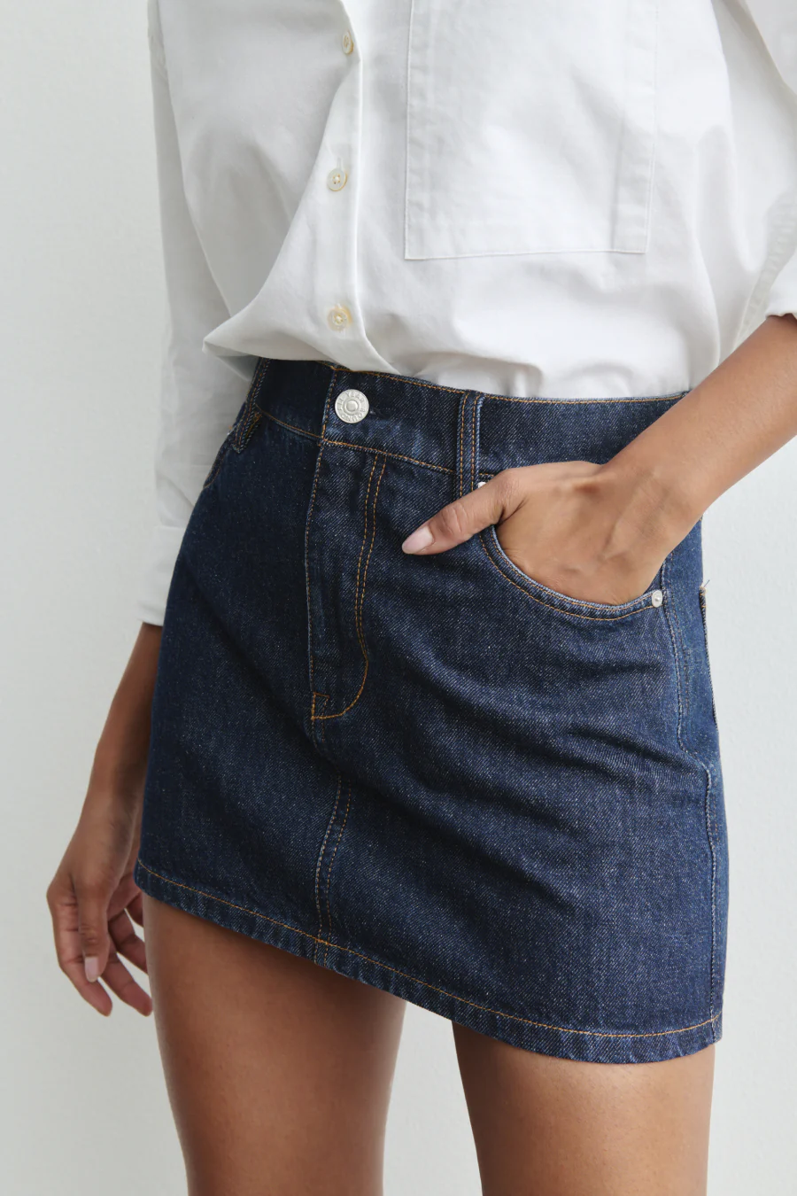A classic 5 pocket denim mini skirt (!!!) in a rich dark wash, crafted from Italian indigo-dyed cotton. Eternally relevant.Â